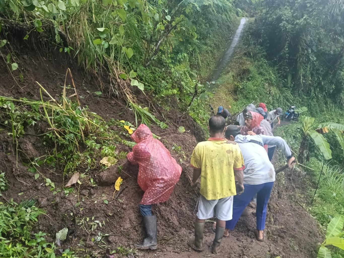 MUNDUK BESTALA – Senin, 12 Januari 2026, Warga Banjar Dinas Sari, lingkungan teben telabah Desa Munduk Bestala, bergotong royong membersihkan material longsoran tanah di Jalan Usaha Tani pada Senin (12/1/2026). Longsoran akibat hujan deras sempat mengganggu akses warga, terutama para petani.